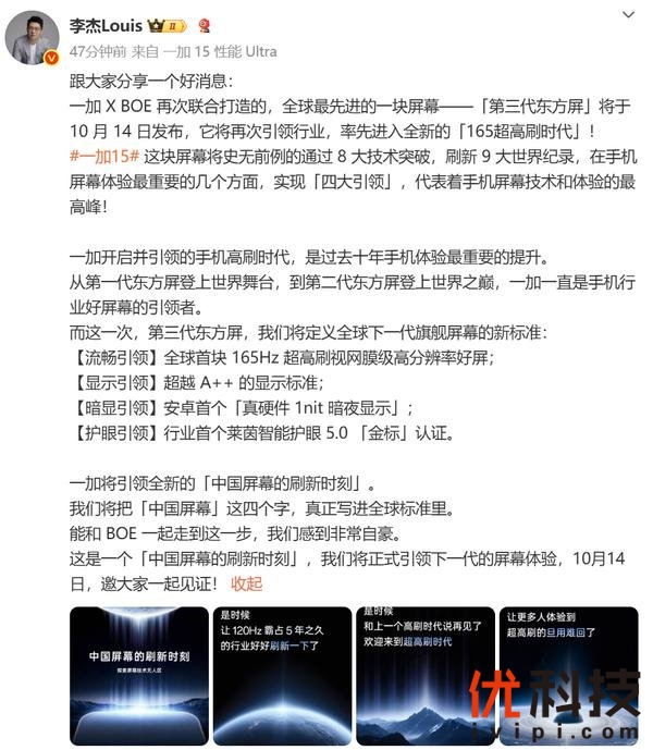 一加与京东方推出史上最强东方屏 10月14日正式发布