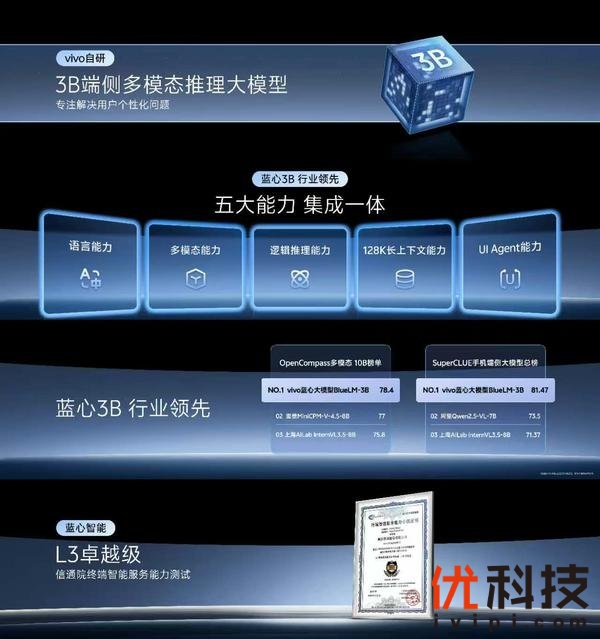经过持续1年的训练优化,蓝心3B端侧大模型成为行业内首个在3B量级,将五大核心能力集成于一体的“One Model”!在多模态行业权威榜单OpenCompass上,蓝心3B端侧大模型实现了越级挑战,超过了榜单上的所有8B模型,做到了10B以内大模型绝对领先!在SuperCLUE手机端侧大模型评测基准上,vivo同样拿到了10B以内总榜第一。在中国信通院《终端智能服务能力分级》测试评估中,vivo的AI达到当前测试最高等级“L3 卓越级”。