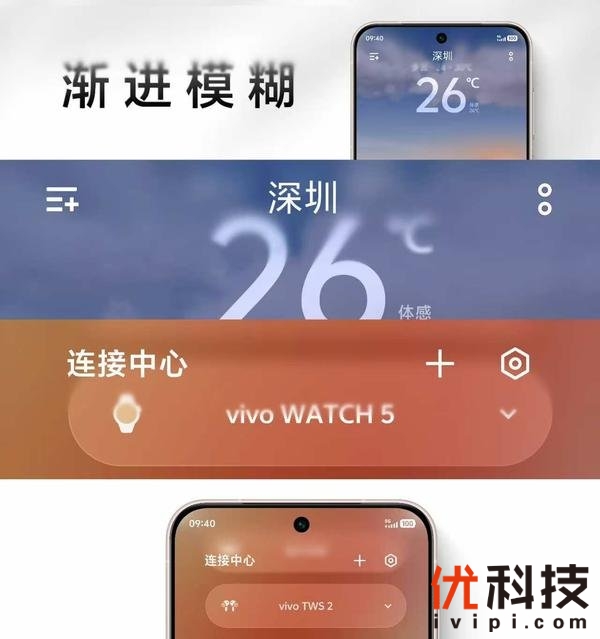 原系统6上,vivo采用更符合自然规律的Spring动效,它可以更精准的复刻真实世界中的物理规律,带来更自然的弹性反馈。滑动通知到顶部或底部,不仅丝滑流畅,更有微微的反馈。在图标移动放置到桌面时,也增加了回弹涟漪效果,下拉控制中心的回弹效果也更自然。不仅如此,在滑动后台等很多高频操作场景中,你都能够感受到Spring力学反馈带来的细腻质感。全新的帧模糊,它让原系统6的界面更有层次感。现在,当组件内文字刷新时,会呈现类似相机镜头的“对焦过程”,在内容变化时,还会呈现一个模糊到清晰的过程,消除了突兀和闪烁感。此外健康关怀、日历等组件及全搜下打开应用等场景中都加入了帧模糊效果,让整个视觉体验显得更加细腻和高级。
