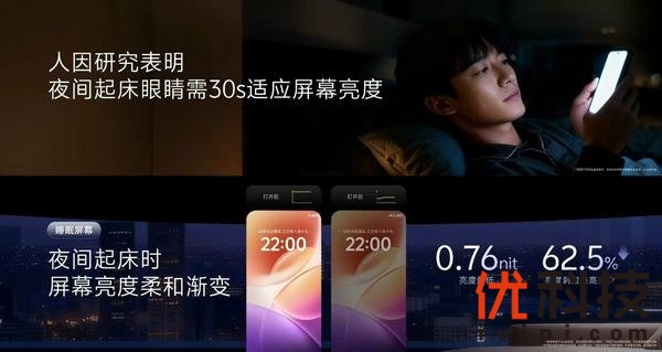 vivo通过人因研究发现,夜间唤醒屏幕时,人眼需要30秒,才能从黑暗中逐渐适应光亮。因此vivo带来全新「睡眠屏幕」功能。当你夜间起床看手机时,屏幕像月光一样温柔地点亮,不会惊扰你的朦胧睡意。屏幕亮度变化,是符合视网膜舒适亮度模型的,亮度最低到0.76nit,亮度刺激最高可以减少62%。让屏幕更懂你的眼睛,亮度调节变得更聪明,也更温柔了,不管你在室内还是户外,手动调还是自动调,亮度都能刚刚好。