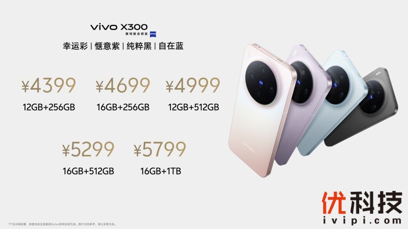 两款新品价格在此次发布会上公布,其中vivo X300 提供12GB+256GB、12GB+512GB、16GB+256GB、16GB+512GB、16GB+1TB共5个版本,售价分别为4399元、4699元、4999元、5299元、5799元。