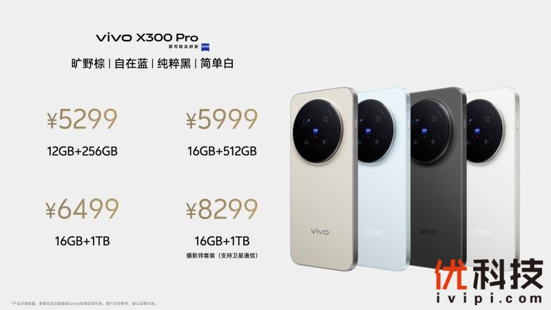 vivo X300 Pro提供12GB+256GB、16GB+512GB、16GB+1TB、16GB+1TB(卫星通信版)共4个版本,售价分别为5299元、5999元、6499元、8299元。