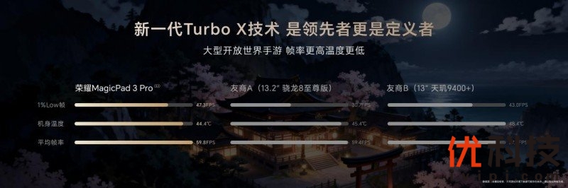 为了实现极致性能释放,荣耀MagicPad3 Pro搭载13层冰封散热系统,导热能力提升26%,并集成新一代Turbo X技术,《鸣潮》游戏帧率与控温表现均领先友商同级机型,《原神》可稳定运行120帧+2.6K分辨率的高画质设置,超分超帧表现达到业界超强。荣耀还联合高通业界首发PC级Q-Sync技术,对齐屏幕刷新率与游戏帧率,丝滑显示无惧延迟撕裂,让玩家看得爽,操控更爽。