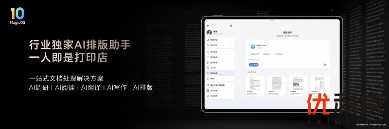 在MagicOS 10加持下,荣耀MagicPad3 Pro带来全新PC级办公体验,从PC级桌面、PC级WPS Office到PC级文件管理,效率全面跃升。荣耀MagicPad3 Pro内置AI文档智能体和AI会议智能体,不仅带来行业独家的一键排版功能,还能实时生成会议纪要与待办事项清单,真正实现会议无忧;而智能识屏功能可即时响应查询,让AI体验全面提升。
