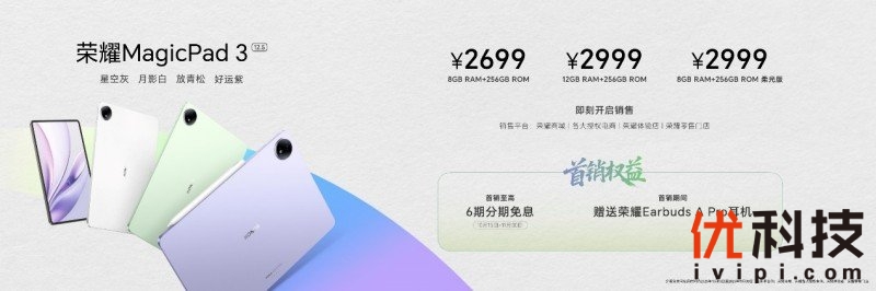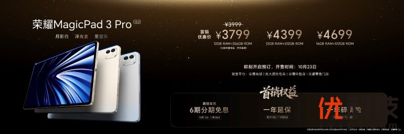 荣耀MagicPad3 Pro拥有浮光金、月影白和星空灰等三款配色,将于10月23日开启全渠道首销,首销优惠价3799元起。