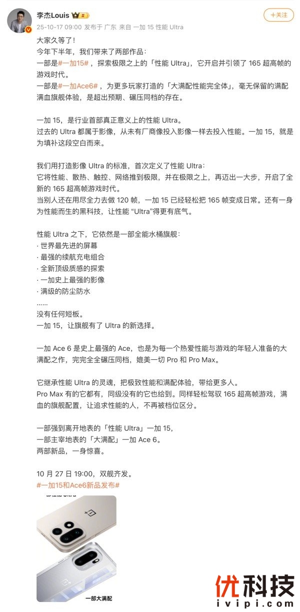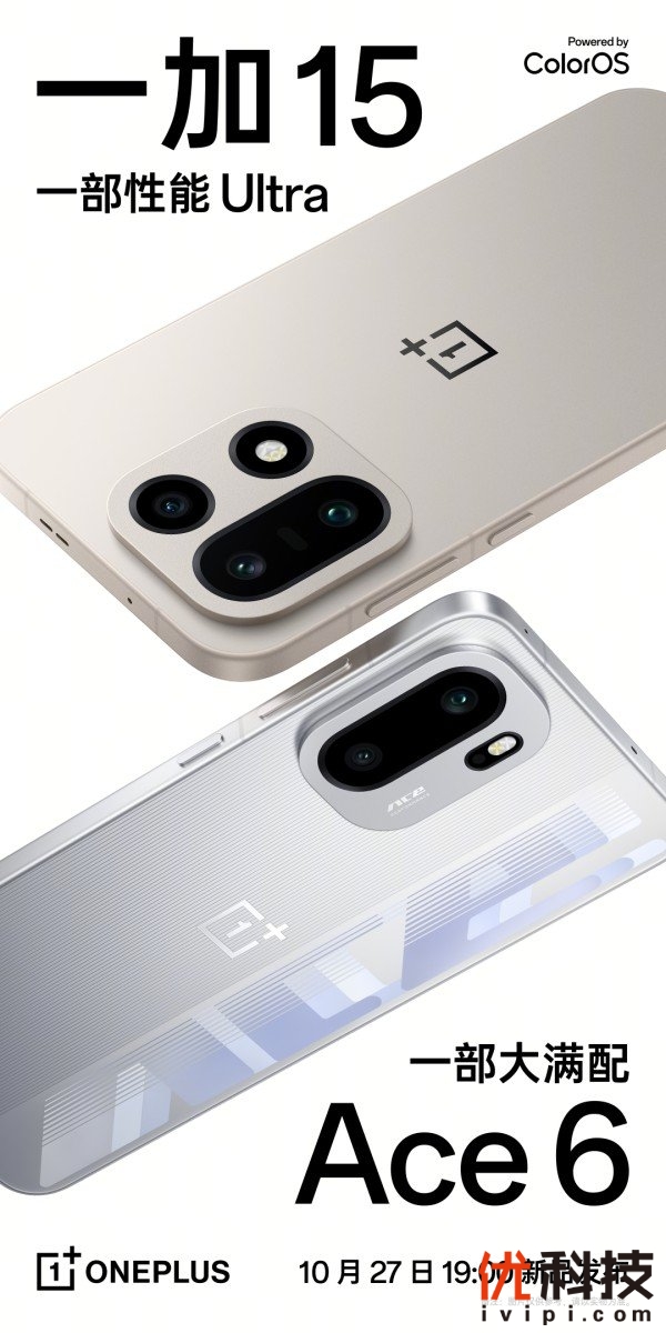 一加 15与一加 Ace 6官宣定档10月27日,双舰齐发打造最强性能体验