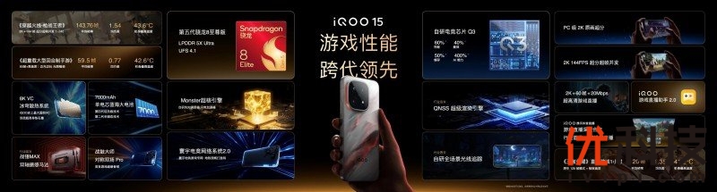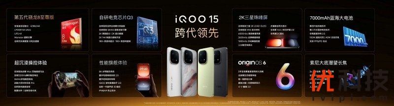 “跨代领先”iQOO 15 传承 iQOO 手机在实力和口碑的双重表现,搭载由第五代骁龙 8 至尊版领衔的“至尊性能组合”完全体,实现行业领先的性能表现,并在自研电竞芯片 Q3 和 Monster 超核引擎的支撑下,带来“全场景光线追踪+ 2K 原画超分+144FPS 无损超帧”,共筑行业领先游戏视效生态;更以全新演绎的国潮设计、超级潜望长焦以及更流畅智慧的 OriginOS 6等一系列强悍配置,打造一款“性能超长板,全面无短板”的未来性能旗舰。