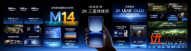 由 iQOO 与 三星深度联合开发的 2K LEAD OLED 技术,开创性地去除偏光层,发光效率大幅提升,实现手动峰值亮度 1000nits、全屏峰值亮度 2600nits 和局部峰值亮度 6000nits 的成绩,且功耗控制和DIC-P3 色域覆盖上也表现出色。