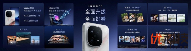全面升级,全面好看。iQOO 15 配备后置 5000 万像素索尼超防抖大底主摄、5000 万像素索尼超级潜望长焦和 5000 万像素超广角以及3200 万像素前置镜头,并得到蓝厂旗舰同款 NICE 算法和大模型画质增强双重技术加持,拍摄出来的照片细节更清晰,大片感十足。另有全面升级的全焦段 LivePhoto、高像素模式、全焦段高像素人像模式和 AI 视效等影像玩法,用 iQOO 15 拍风光拍人文,全面好看。