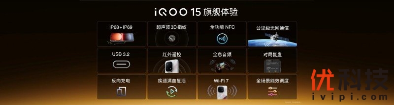 全面无短板,iQOO 15 搭载全新一代超声波 3D 指纹、IP68 & IP69 防尘防水、Wi-Fi7、全功能 NFC、UWB车钥匙、公里级无网通信和红外遥控等,一步到位,全部顶满。
