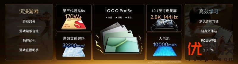 “永劫无间手游和王者荣耀职业联赛双推荐平板”iQOO Pad5e,它搭载第三代骁龙8s、12.1 英寸高清电竞屏、3W+mm² 高效立体散热、10000mAh 大电池,硬实力不虚,游戏超分更是同档断层领先,PC级WPS+ CAJViewer 更是专业生产力升级,学习办公超轻松;iQOO WATCH GT 2 搭载屏占比高达 82.4% 的 2.07 英寸超亮全景屏,局部峰值亮度 2400 尼特,配有 100 多种运动模式,不但可以记录心率、热量等数据,还具备全新电竞模式、接入满血版 DeepSeek 的蓝心小 V 和碰一碰遥控器,33 天超长续航,更是做到全天候健康监测;iQOO TWS 5 全链路游戏延迟低至 42ms,四麦自适应降噪,降噪深度飙至 60dB,拿下 A+ 级 CAIA 降噪能力认证,并有升级的 Monster Sound 电竞声效和 48 小时超长续航,体验更好的跨生态无缝三连接和实时智慧翻译,全新主题弹窗,更有 KPL 电竞选手无畏定制弹窗和定制提示音,是专为游戏玩家打造的旗舰降噪耳机。