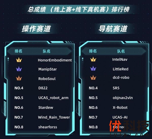 而荣耀机器人团队凭借“仿真预训练 + 真机轻量化微调”的路径,不仅有效攻克了这两大难题,实现高效部署与高精度执行,还在1小时的线下决赛中展现出“开箱即用”的硬实力——机器人全程稳定运行,任务完成率远超第二名30个百分点,最终以绝对优势摘得冠军,充分彰显出团队领先的具身AI工程落地部署能力,也为具身智能技术从实验环境走向真实应用按下了“加速键”。