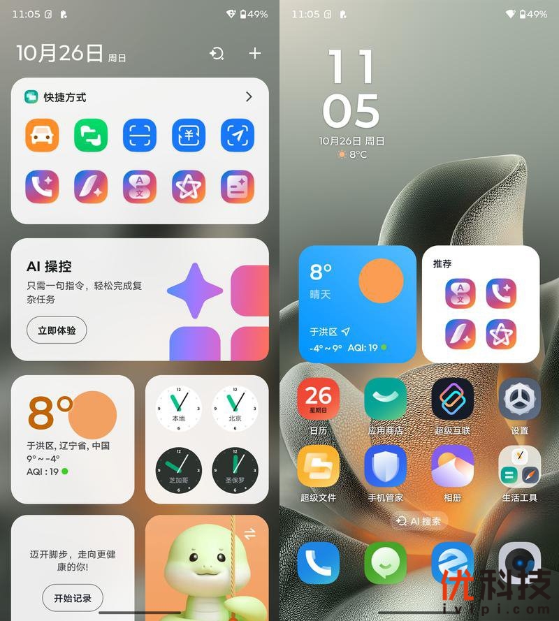 首先是页面设计,全新的myui 8.0桌面图标更加灵动,并且自定义程度更高,在负一屏依旧集成了多种快捷方式,例如一键出行、微信扫码等等,并且还集成了天气、各地时区时间以及运动步数等等,同时在快捷方式中还加入了AI快捷功能。