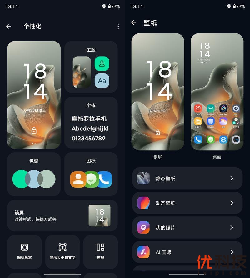 桌面个性化方面,首先主题壁纸自定义程度很高,同时还支持字体、色调、图标、锁屏的自由调节,并且还支持壁纸的动态、滤镜自定义功能。