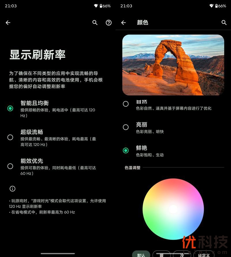 屏幕显示方面,系统内提供自然、亮丽以及鲜艳三种可选,并且支持自定义色温调节,至于刷新率方面则是提供了智能、超级流畅以及能效优先三档可选,默认选择智能即可。