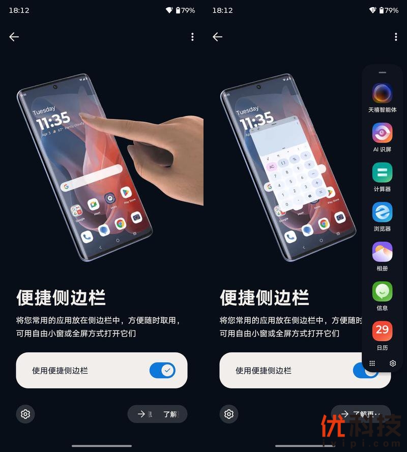 联想moto X70 Air持便捷侧边栏功能,默认侧边栏为单列设计,集成了常用功能,同时在侧边栏中还可以开启手机内的所有应用,临时划出使用还是很方便的,避免了烦琐的应用切换。该机还支持多项便捷操作,例如双击亮屏、熄屏以及双击手机后背快捷操作等等。