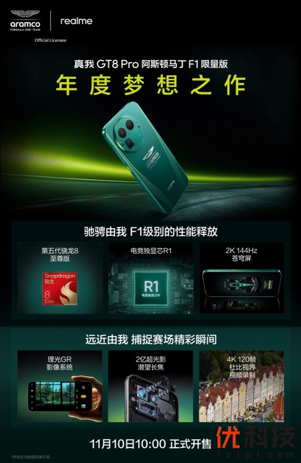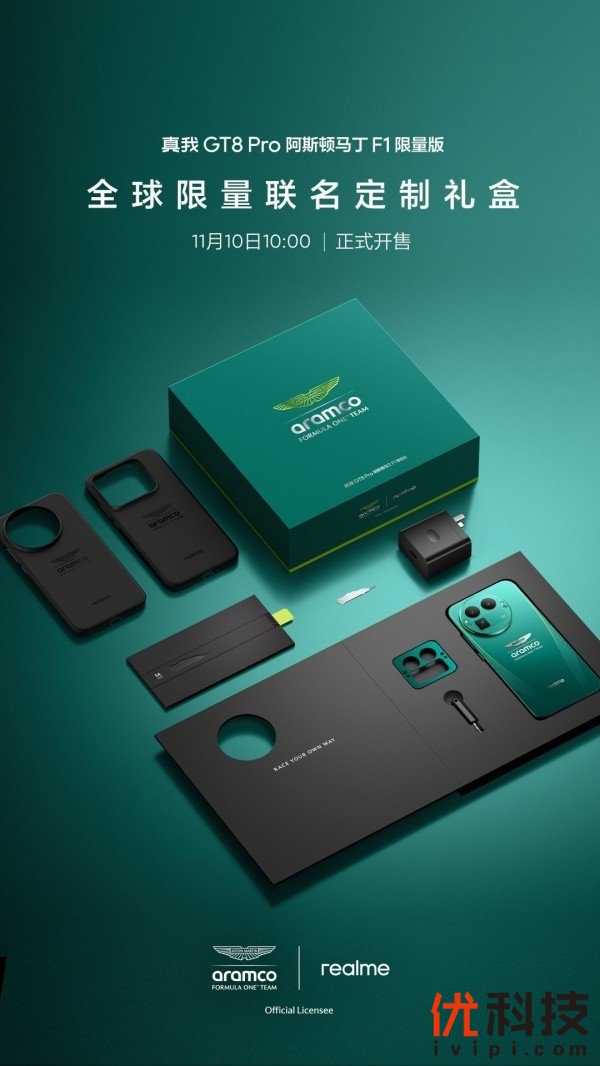 2025年11月10日——中国·深圳——真我GT8 Pro阿斯顿马丁F1限量版于今日10:00正式开售,16GB+1TB售价5499元。作为真我与阿斯顿·马丁沙特阿美F1®车队再度联手的巅峰之作,它不仅是越级科技与赛道美学的完美融合,更是对"F1赛车精神"的全新定义。