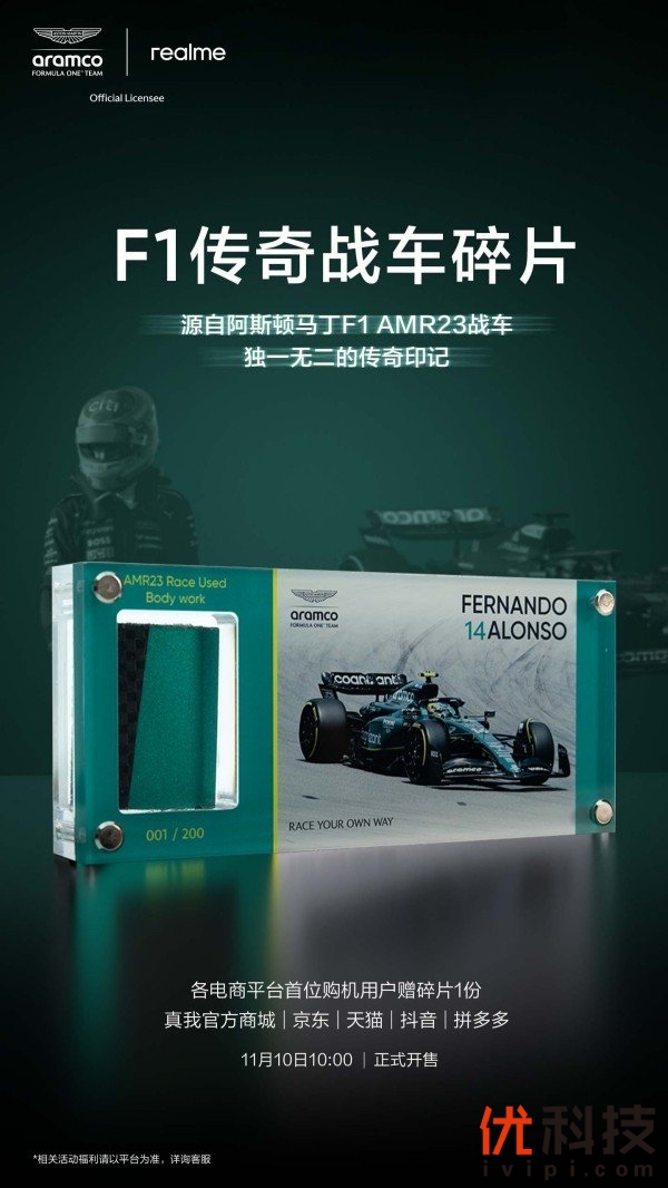 为致敬费尔南多·阿隆索在2023赛季驾驶AMR23赛车8次登上领奖台的辉煌成就,真我还特别推出了"F1传奇战车碎片"收藏计划。真我将这辆承载着无数荣耀的真实赛车退役零件,从赛道带到粉丝的面前。全球限量200枚的碎片,每一枚都拥有专属编号,各渠道开售第一名下单者即可获得这份荣耀,这是真我对F1精神的最高致敬,也是最强珍稀联名收藏套装。