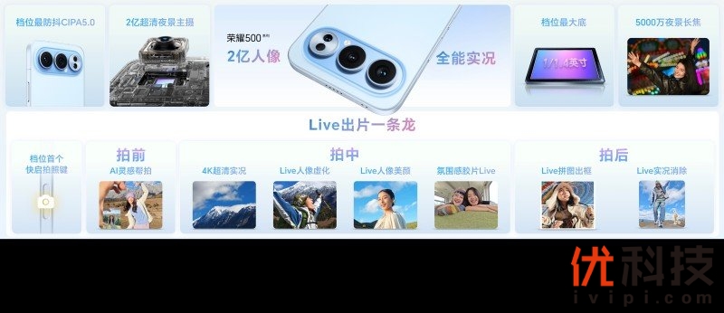 荣耀500全系延续2亿AI超清人像基础,配备档位最大1/1.4英寸大底传感器及1200万超广角镜头,荣耀500 Pro还带来5000万双防抖长焦镜头,支持CIPA5.0旗舰级防抖等级,无论面对手抖还是复杂光源,都能保证成片清晰度和曝光效果,从而带来档位超稳、超清晰的影像拍摄能力。