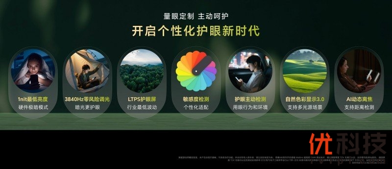 荣耀持续引领行业护眼赛道,荣耀500系列支持九大荣耀绿洲护眼特性,覆盖了自然光的波动、频闪、亮度、节律、光谱和色彩六大视觉维度,还提供了AI离焦护眼、AI干眼友好和晕动舒缓显示三大辅助护眼功能,不仅对于不良用眼行为进行主动提醒,还能智能检测不良环境光源,为用户构建对眼睛更加友好的居住和办公环境。