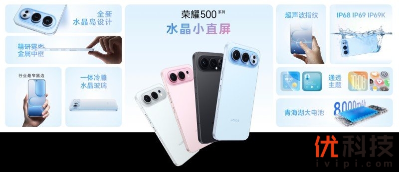 荣耀500系列还采用行业领先的一体冷雕工艺,历经40多道工序反复打磨,实现了镜头模组与背板玻璃的一体成型,质感浑然天成。得益于机身架构的重构,不仅实现7.75mm的轻薄机身和行业最窄1.05mm黑边,其独特的水晶岛镜头模组设计,也带来了更优的握持体验,无论是竖屏使用还是横屏游戏都舒适趁手,同时为超大电池预留出充足空间。