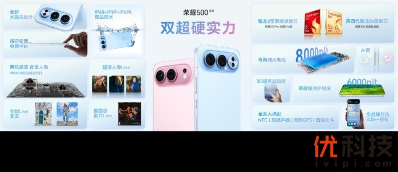 此外,新机支持IP68&IP69&IP69K行业至高防水等级,可靠性全面进阶。荣耀500 Pro还配备旗舰同款超声波指纹,湿手秒解,响应迅速,在细节处彰显旗舰级品质。
