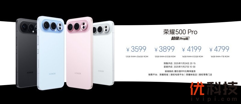 荣耀500系列共带来“海蓝宝”、“星光粉”、“月光银”、“曜石黑”4款水晶配色,售价方面,荣耀500标准版12GB+256GB、12GB+512GB和16GB+512GB版本售价分别为2699元、2999元和3299元;荣耀500 Pro版12GB+256GB、12GB+512GB、16GB+512GB和16GB+1TB版本售价分别为3599元、3899元、4199元和4799元。现已在荣耀商城、授权电商平台、荣耀体验店、授权零售门店开启预售,并于11月27日10:00正式开售,首销购机赠价值999元尊享服务。