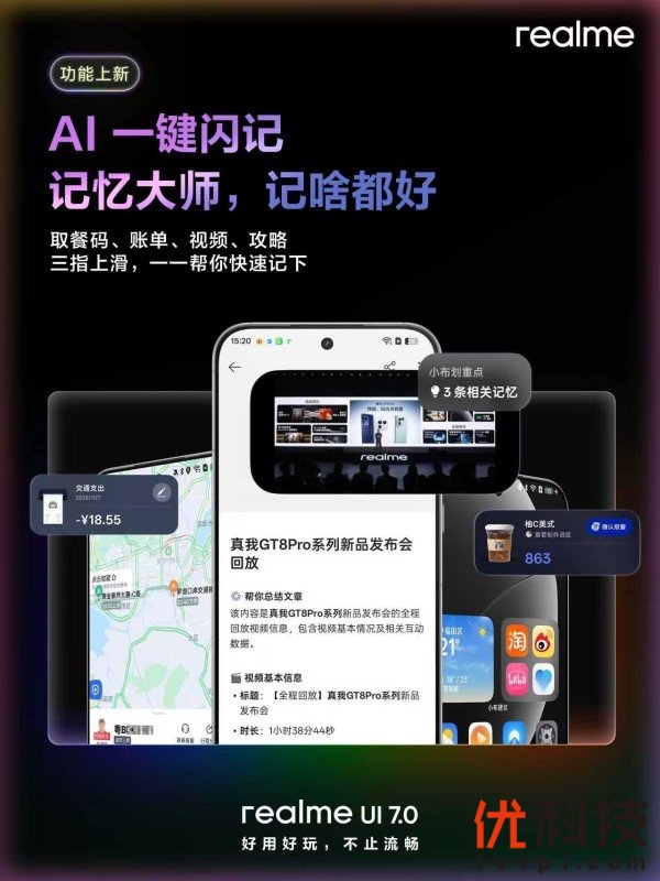 realme UI 7.0正式版标志着真我在AI智能、设计美学和流畅体验三大维度的全面进化。从"指哪答哪"的AI实景对话,到"三指上滑"的AI一键闪记,从光影玻璃的视觉美学,到芯片级动态调度的流光引擎,再到打破生态壁垒的跨设备互联,realme UI 7.0正在用技术创新和畅快体验,重新定义"好用好玩,不止流畅"的安卓系统新标准。