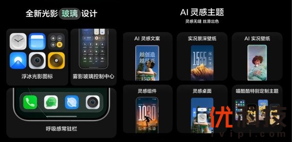 系统采用高透明度处理与柔和模糊层技术,使信息层次清晰可辨,营造出纯净、开放的视觉体验。浮冰光影图标通过恰到好处的间距与网格化秩序,呈现呼吸般自然的轻盈节奏,让每一次交互都充满生命感。雾影玻璃控制中心和呼吸感常驻栏进一步强化了系统的通透立体质感,让整个界面"处处都精致"。