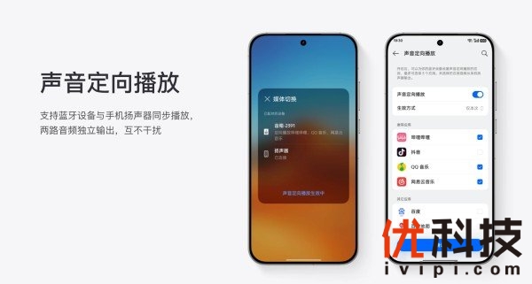 此外,声音定向播放功能让用户可以自定义音频播放通道,蓝牙音箱和手机扬声器可同时播放不同音频,无论是打游戏时想听音乐,还是车上用蓝牙车机放歌的同时手机外放导航,都能实现互不干扰的独立控制。