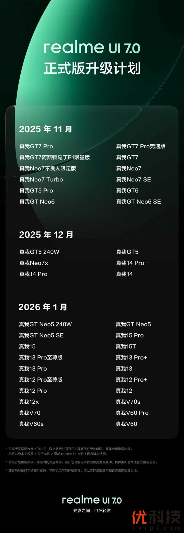 首批搭载realme UI 7.0的真我GT8系列用户已开始接收系统更新推送,本月,包括真我GT7 Pro、真我GT7阿斯顿马丁F1限量版、真我Neo7系列等多款机型将陆续迎来更新。至2025年12月,真我GT5系列、真我Neo7x以及真我14系列等机型也将获得推送。随后,在2026年1月,升级范围将进一步扩大,确保大部分用户能够体验到realme UI 7.0的最新功能。