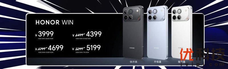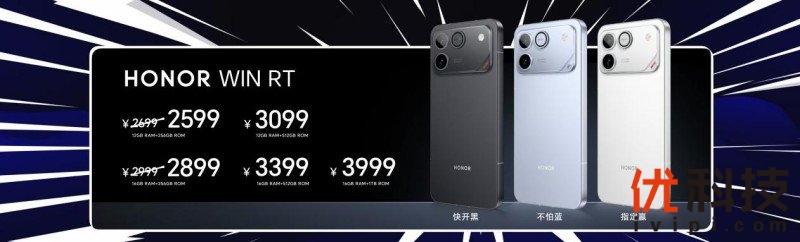 荣耀WIN与荣耀WIN RT拥有“快开黑”“指定赢”“不怕蓝”三款配色,起售价分别为3999元、2699元。首销期间,荣耀WIN 12GB+512GB、16GB+512GB、16GB+1TB版本,荣耀WIN RT 12GB+256GB、16GB+256GB版本限时优惠100元。