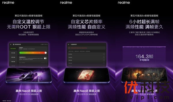 2026年1月16日—中国 · 深圳— 真我Neo8性能配置正式揭晓,将于1月22日19:00开启产品发布会。真我Neo8全面构建三层性能金字塔:第五代骁龙8旗舰芯提供核心性能释放,GT性能引擎实现智能调度优化,行业唯一极客性能面板带来高阶自定义,三层协同狠超性能上限,开启高阶性能时代。搭配全球首发165Hz三星苍穹屏,全面打造"165Hz潮玩电竞旗舰"。