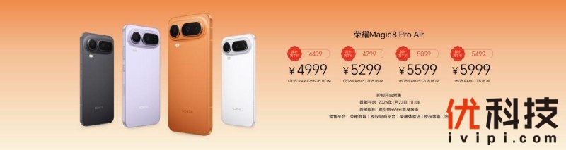 售价方面,荣耀Magic8 Pro Air 12GB+256GB、12GB+512GB、16GB+512GB和16GB+1T版本售价分别为售价分别为4999元、5299元、5599元和5999元,国补到手价分别为4499元、4799元、5099元和5499元。荣耀商城、授权电商平台、荣耀体验店、授权零售门店现已开启预售,并于2026年1月23日10:08正式开售,首销购机赠价值999元尊享服务。
