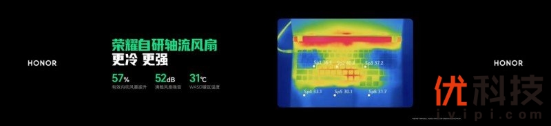 除此之外,荣耀还融入三角蝉翼长短鳍片、三矩形矢量热管、键盘风道设计、超百扇叶静音风扇等散热设计,打造当前游戏本行业最强的散热方案,助力玩家猛攻到底。