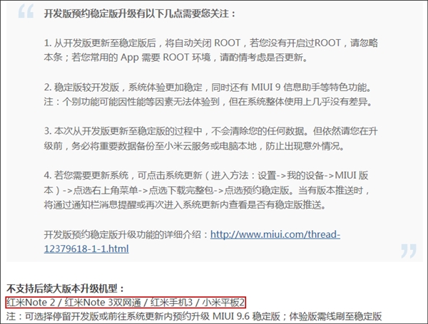 帖子还提到,后续大版本升级将不再进行适配的机型,具体是红米Note2、红米Note3双网通、红米手机3和小米平板2。而这里所提到的大版本应该就是指一年一次的升级,也就是很多人在期盼的MIUI10。