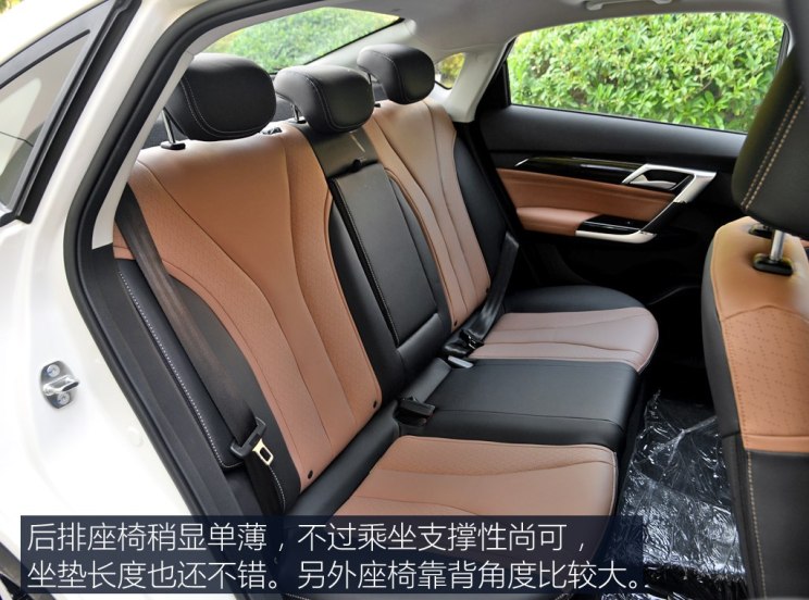 后排座椅靠背稍显单薄,乘坐的支撑性比较好,坐垫长度490mm,长度不错对于乘客大腿的支撑有一定帮助。靠背的倾斜角度较大,对于舒适性有一定帮助,角度大通常要比角度小舒适性要高一些。