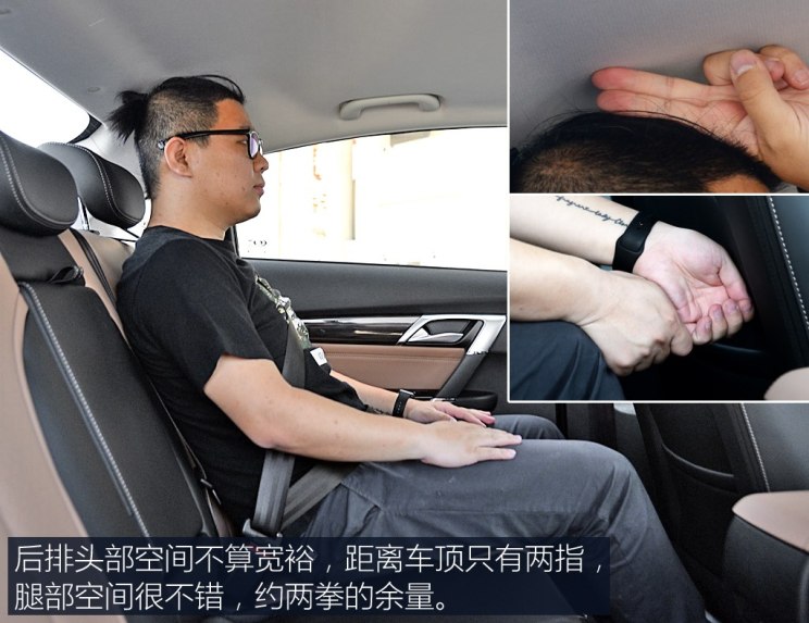 体验者身高173cm,主驾座椅降至最低后,驾驶者头部还有约四指的空间余量,空间比较宽裕,作为轿车表现还不错。受限于车尾造型,后排头部空间表现一般,只有约两指的余量,不过腿部空间很好,距离前排座椅靠背约两拳。