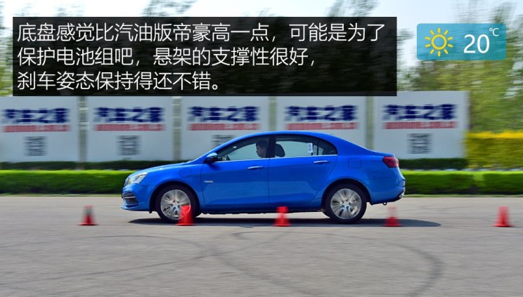 电动助力转向的手感比较轻,底盘也无法反馈太多的路感,不过我想没有太多车主会在乎这些,只要舒适性OK就足够了。前麦弗逊、后扭力梁的设计和汽油版帝豪没区别,电池组被安放在车底中央的位置,有助于降低重心。所以,这款EV450的操控还是可以的,至少在绕桩环节车辆没有推头的迹象,一向挑剔的我对它也没有任何抱怨。