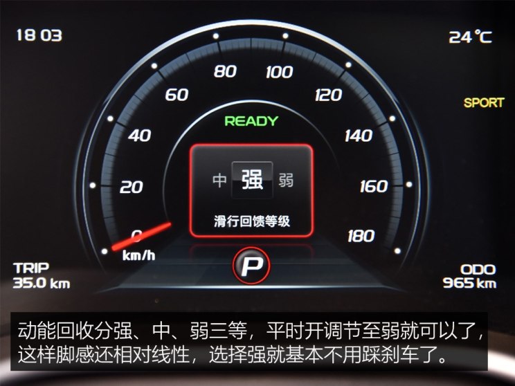 对于第一次驾驶电动车的人来说,刹车脚感可能会有些不适应,因为它有动能回收系统,收油时系统就会回收动能,就像有人帮你踩刹车一样。动能回收分强、中、弱三等,平时开调节至弱就可以了,这样脚感还相对线性。如果调至强,那么平时驾驶的时候,除了最后停下那一刻,其它时候基本就不用踩刹车了。但我不建议广大车主这么做,因为车辆在回收动能时,刹车灯是不亮的。也就是说,虽然车辆在减速,但是并不会提示后方车辆注意,所以很容易发生追尾事故。