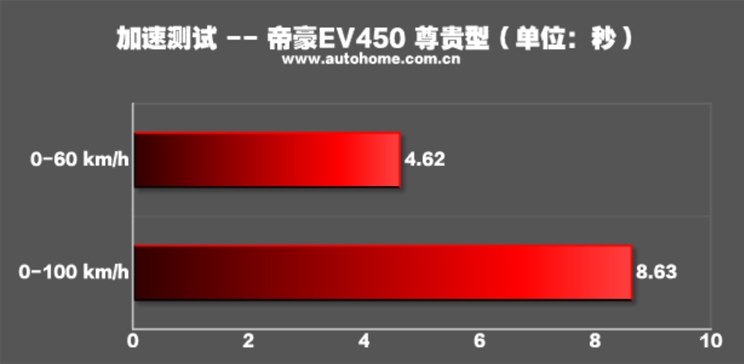 相比之前的帝豪EV300,EV450在电机、电池以及电池温控系统方面都有所提升。除了最直观的续航里程增加了,电机也更有劲了。它的最大功率达到了120kW(163马力),最大扭矩250牛·米,官方公布的0-100km/h加速时间9.3秒,我实测的加速成绩是8.63秒,主观感受还是很快的。