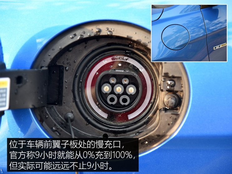 帝豪EV450有快充和慢充两个接口,位于前翼子板的是慢充口,可以利用随车赠送的慢速充电器连接家庭的220V单相电进行充电。官方称使用6.6kW慢充桩需9小时能从0%充到100%,若使用3.3kW家用慢充盒需19个小时充满。所以在着急的情况下,使用慢速充电是不切实际的。不过如果你家里安装了充电桩,那么倒是可以采用这种方式,毕竟慢速充电有助于延长电池寿命。此外,慢充口还解锁了一个新功能,即可以通过随车附送的放电线输出220V交流电为便携式的用电设备供电。