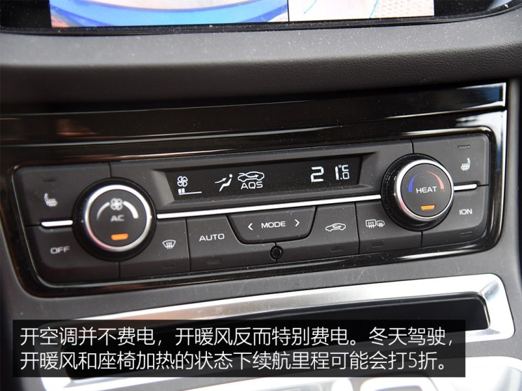 另外,开关空调其实对于续航里程的影响并不大,反而开启暖风或者座椅加热对于电量的消耗是巨大的。这两点在这几天的测试过程中也得到了充分的验证。例如提车当天,北京一直在下雨,气温较低,于是我便将自动空调设置在23℃,车辆自动开启了暖风。当我行驶了50km之后,车辆表显的续航里程却减少了100km,由此可见,如果是在寒冷的冬天,它的续航里程将会大打折扣。