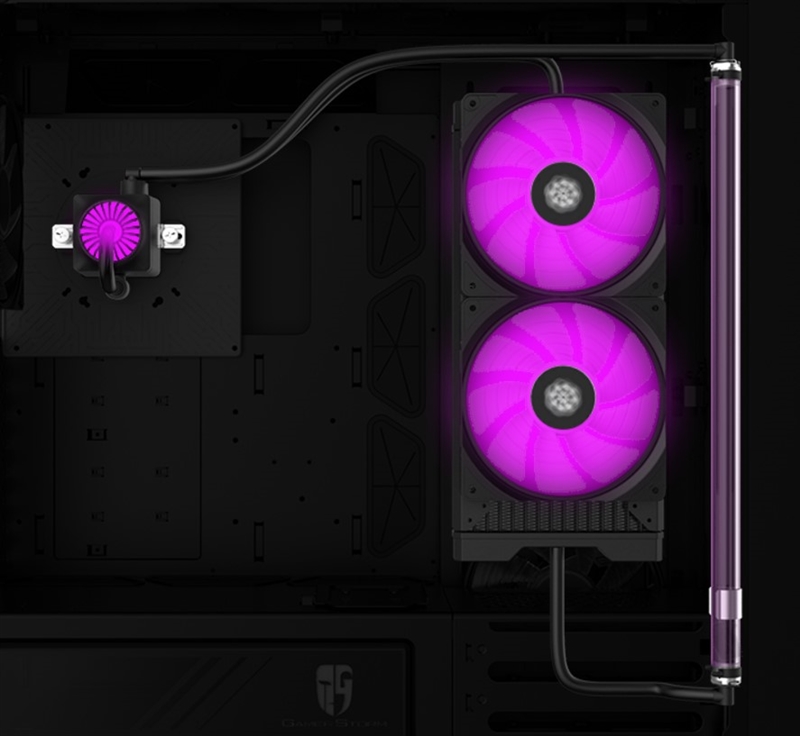 内置的九州风神船长280采用了类似于分体水冷的设计。前面板集成了一只长长的水罐,使得水冷液的容积远远高于普通的280一体水冷,在高负载下长时间运行也能保证水冷液温度不会过高。