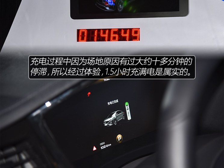 因为现场客观条件的缘故,充电时中断了十几分钟,减去这些时间,我们可以看到电池电量从零到满用时在一个半小时左右,对于用户来说,充电时间短就意味着用车效率的提升。不过作为插混车型,不充电也能跑,只是会多费点儿油。