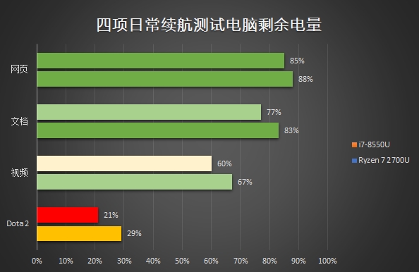 可以看到,在4个续航测试项目中,Ryzen 7 2700U的续航表现都比i7-8550U更好,最终剩余电量也比其高出8%,达到了29%。