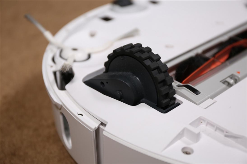如上图,底面一半是传感器和部件,一半是放拖把水箱的区域。相比于前代,经过调整优化的轮子悬挂,已经从从一代的1.5cm提升到了2.0cm,“底盘更高”,越障能力更强。