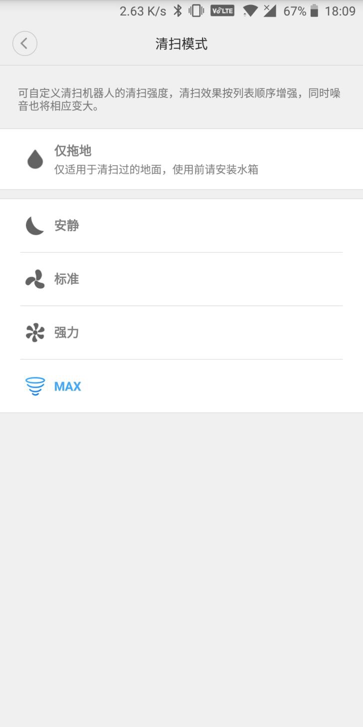 通过APP连接,还能控制石头进行定时清扫、查看清扫记录、定位机器人等。而且石头有着5种清扫模式,分别是仅拖地、安静、标准、强力、MAX,功耗以及清扫强度依次增大,拓宽了应用场景。