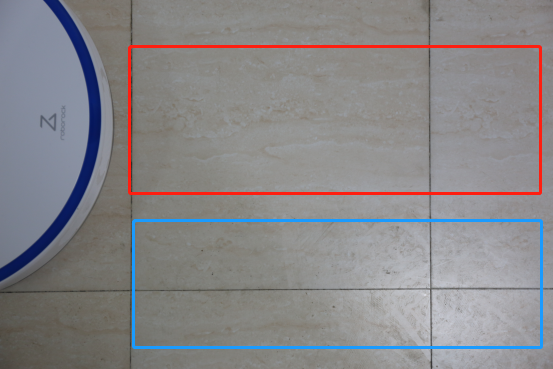 如图所示,石头机器人所经之处(红色方框)的泥渍已经不见,还了地板砖本来面目。而未经打扫的蓝色框区域则依旧污垢遍布,这对比显而易见。在测试过程当中,笔者还发现其扫拖时,均匀出水,即拖即干;不动时,拖布自动停止渗水,确实做到了收放自如。