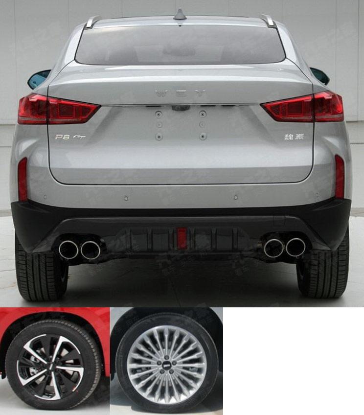 外观部分,其沿用了WEY P8的大嘴式进气格栅,与WEY P8不同的是,其保险杠面积更大,相对发动机舱盖面积有所减少,因此两这结合线更为明显。同时大灯组采用了全新造型,翼子板上配有金属装饰。车身尺寸部分,其长4790mm、宽1940mm、高1672mm,相比WEY P8更长、更宽、更高,但二者轴距完全一致。从尾部看,其结合了GT车型与SUV车型的特点,后备厢盖左侧有P8 GT标识,右侧有“魏派”汉字字样。